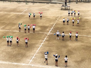 赤、青、黄、緑のポンポンを持ってとても楽しそうに踊っています。隊形移動も工夫されています。