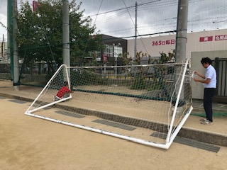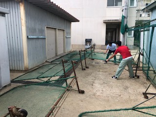 強い勢力の台風19号接近に備えて校舎外にあるものを飛ばされないようにしました。各ご家庭でも昨年の台風21号と同等の備えをお願いします。