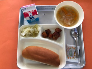今日の献立は、「コッペパン・アプリコットジャム・牛乳・まぐろのオーロラ煮・じゃがいもとベーコンのスープ・キャベツのゆずドレッシング」です。まぐろのオーロラ煮は大好評の献立のひとつです。揚げたまぐろに、ケチャップ、砂糖、赤みそで作ったたれをからめます。