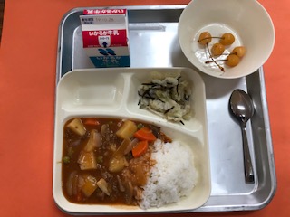 今日の献立は「ハヤシライス(米粉)・キャベツのひじきドレッシング・さくらんぼ(缶)・牛乳」です。いつものハヤシライスは、小麦粉で作ったルウを加えていますが、今日は小麦粉を使わずに米粉を使っています。また、さくらんぼ(缶)は、赤く色づけをしていないので、自然の果肉の色のままです。