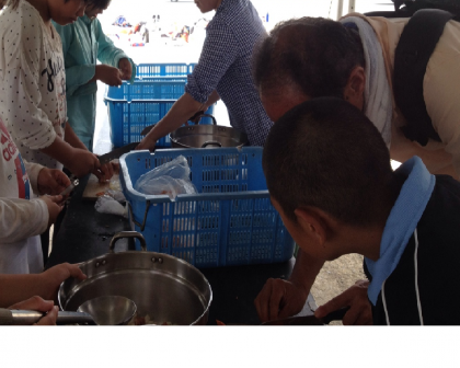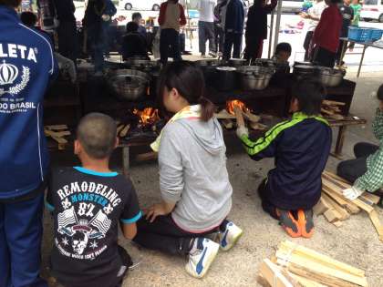 宿舎横での飯ごうすいさん。かまどの火と煙に暑い〜 目が痛い〜 と言いながらも美味しいカレーライスが出来上がりました。