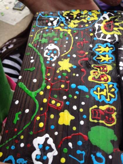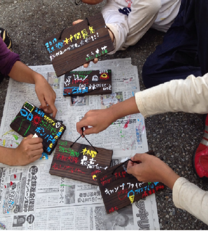 焼き板作りは、一枚一枚表情の違う板を丁寧に磨いて木目を出します。絵具は全部で五色、色を混ぜればバリエーションは無限大に広がります。魚掴み、キャンプファイヤー、山の風景、青い空を描いているいる子どもが多かったです。林間の楽しい思い出が残せました。