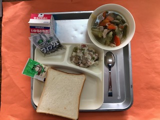 今日の献立は、「食パン・ソフトマーガリン・牛乳・鶏肉とじゃがいものスープ煮・きのこのドリア・ミニフィッシュ」です。ドリアにはエリンギ、しめじ、マッシュルームの3種類のきのこを使っています。ドリアは、お米を使った料理で、料理をしたご飯の上にホワイトソースをかけて焼いたグラタンに似た料理です。
