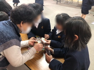 地域の方やPTA、平野区役所CAT隊の皆様をゲストティーチャーに招き、「折り紙」「あやとり」「竹とんぼ」「百人一首めくり」を教えていただきました。