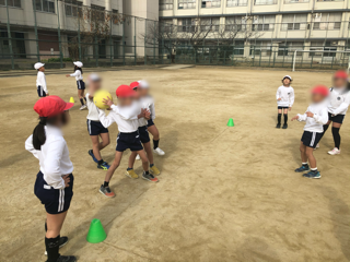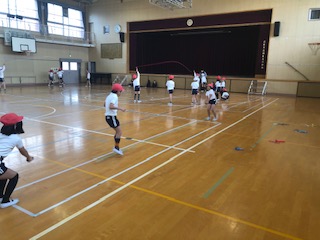 体育科の学習で体つくり運動とボール投げゲームに取り組んでいます。元気いっぱい活動しています。