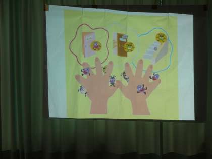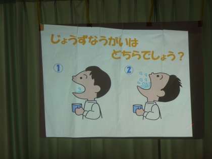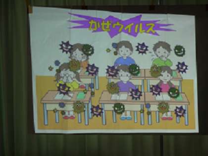体重測定の前に、養護教諭の先生から、風邪にかからないために、「手洗い」「うがい」をしっかりしましょうというお話を聞きました。