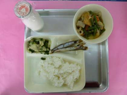 今日の献立は、ご飯、焼きししゃも、鶏肉とじゃがいもの煮物、大阪白菜の胡麻和え、牛乳です。