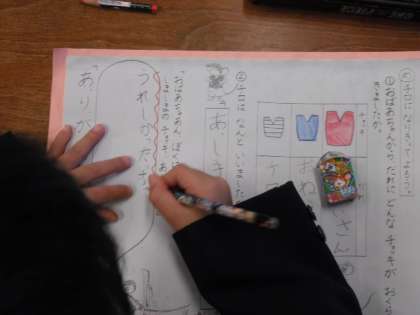 今日は、チョッキを見たときのチロの行動や会話からチロの様子を想像したり、嬉しさを表す言葉の違いに気づき工夫して音読したりしました。