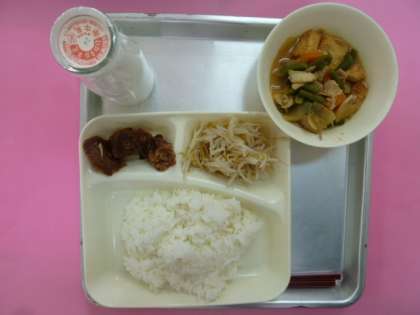 今日の献立は、ご飯、くじらの竜田揚げ、豚肉と里芋のみそ煮、もやしの柚子の香和え、牛乳です。