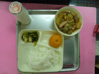 今日の献立は、ご飯、関東煮、白菜とほうれん草のおひたし、みかん、牛乳です。