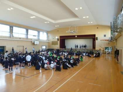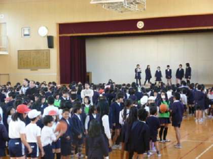 低学年と高学年が交互に並びボールを両手で持って横から後ろの人に回していきました。