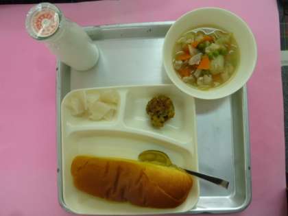 今日の献立は、パンプキンパン、たこボール、洋風煮、大根のサラダ、牛乳です。