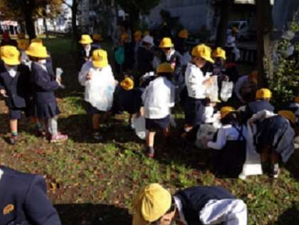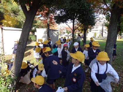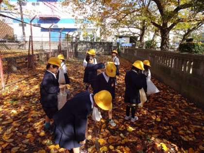 いい天気でした。1年生は、元気よく「落ち葉拾い」に出かけました。