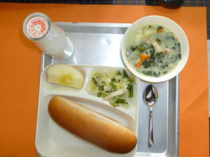 今日の献立は、黒糖パン、ほたてがいのクリームシチュー、キャベツとさんど豆のサラダ、りんご牛乳です。