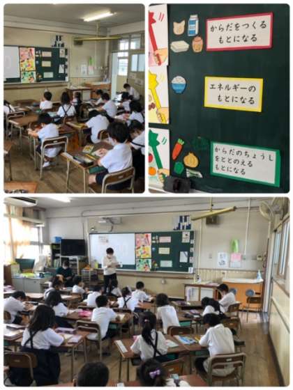 1年生は食べ物について学びました。体をつくるもとになる食べ物や体の調子を整えるもとになる食べ物などがあることを知りました。