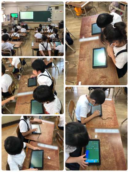1年生はタブレットの起動の仕方を学びました。自分のクラスとパスワードを入力することで起動します。子どもたちの覚える早さに驚かれました。今日はお絵かきソフトで自分の好きな絵を描いて楽しみました。