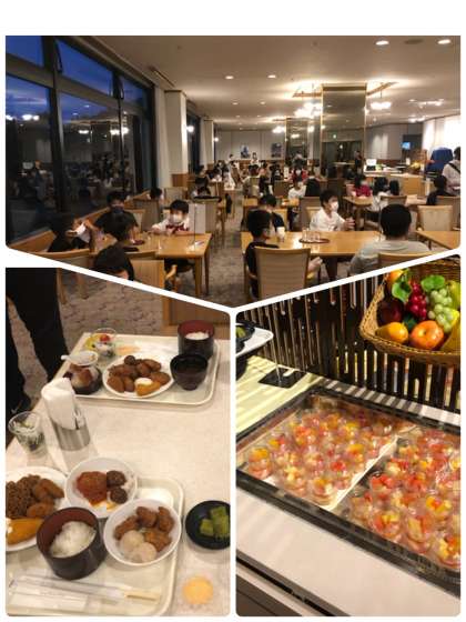 レストランに入る前に消毒と検温を済ませ、生活班で夕食を美味しくいただきました。
