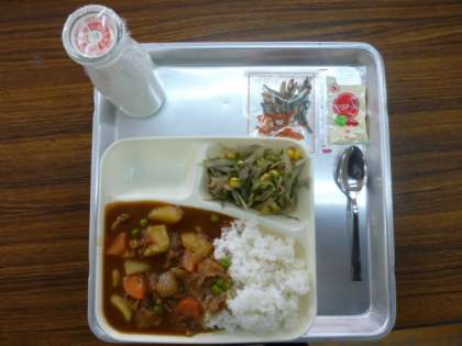 今日の献立は、ポークカレーライス、ごぼうサラダ、アーモンドフィッシュ、牛乳です。