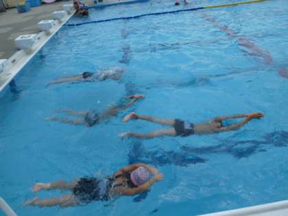 夏休みのプール開放中に、「特別練習」の時間を設定しています。参加した児童は、一生懸命練習をしていました。