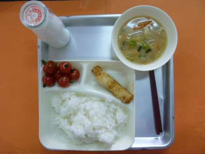 今日の献立は、ご飯、まだらのから揚げ、里芋の味噌汁、プチトマト、牛乳です。