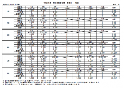先日、お子さまを通じて配付しました「令和3年度 徴収金振替金額・振替日一覧表」を再掲します。ホームページ右側の「配付文書」事務室よりにも掲載していますので、必要に応じてご覧ください。令和3年度 徴収金振替金額・振替日一覧表