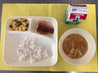献立は「あかうおのしょうゆだれかけ・みそ汁・えんどうの卵とじ・ごはん・牛乳」です。あかうおは骨もほとんどなく食べやすいです。春から初夏が旬のえんどうは、ひとつずつさやから豆を取り出して調理しています。卵でとじずに卵アレルギー対応献立を実施しました。