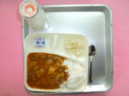 今日の献立は、ハヤシライス、カリフラワーのピクルス、固型チーズ、牛乳です。