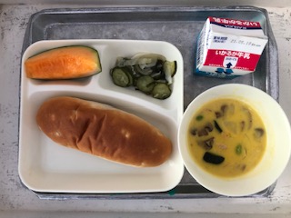 献立は「かぼちゃのクリームシチュー・ミックス海そうのサラダ・クインシーメロン・おさつパン・牛乳」です。クインシーメロンは種を取って一人1/8切ずつです。