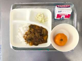 献立は「夏野菜のカレーライス・キャベツのサラダ・みかん(冷)・牛乳」です。