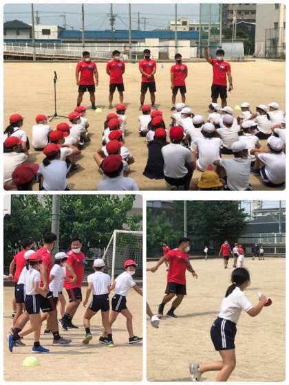 NTTドコモ レッドハリケーンズ(ラグビー)に来校していただき、高学年を対象にトップアスリートによる「夢・授業」を行いました。