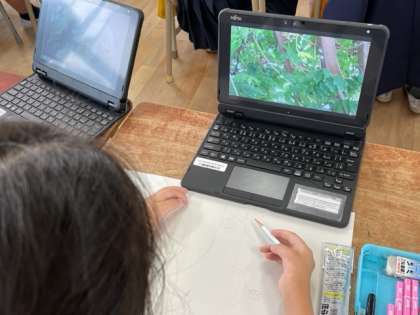 身近な自然の形や色を絵にかく学習でした。