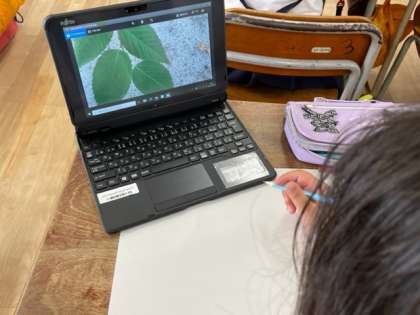 タブレットを使って、校庭にある草花や葉っぱを