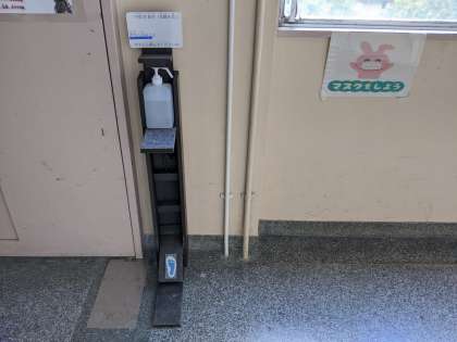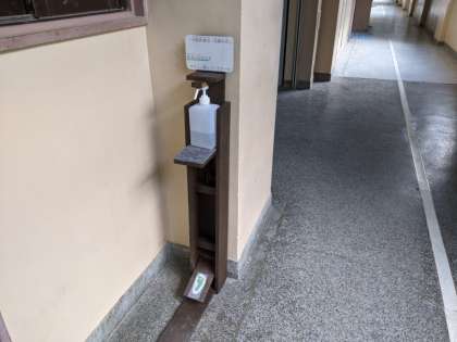 このたび、本校管理作業員による手作りの 「手指消毒台(足踏み式)」が完成し、1階の管理作業員室前と2階の校長室前に配置しました。