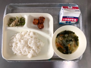献立は「まぐろのオーロラ煮・すまし汁・もやしとピーマンのいためもの・ごはん・牛乳」です。