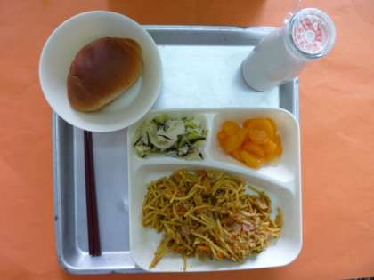 今日の献立は、2分の1黒糖パン、カレースパゲッティ、キャベツのひじきドレッシング、みかん(缶)、牛乳です。