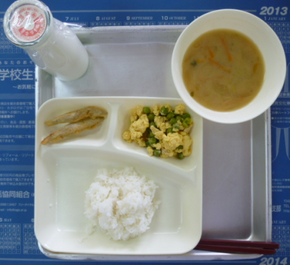 今日の献立は、ご飯、きびなご天ぷら、味噌汁、えんどうの玉子とじ、牛乳です。