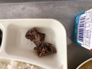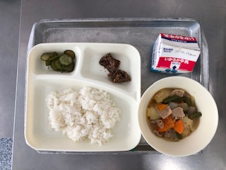献立は「くじらのたつたあげ・豚肉とじゃがいもの煮もの・きゅうりの赤じそあえ・ごはん・牛乳」です。くじらのたつたあげは、しょうが汁、料理酒、こいくちしょうゆで下味をつけたくじらにでんぷんをまぶして熱した油であげます。