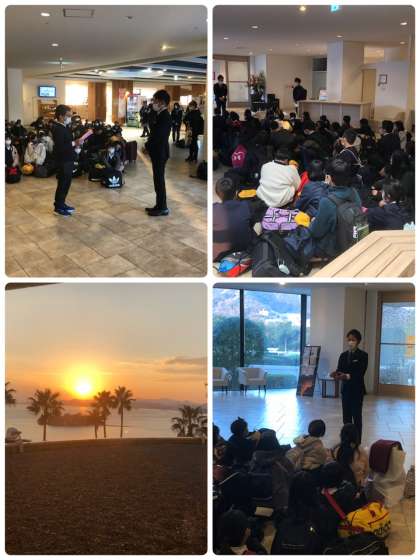 宿泊するホテルに着きました。開舎式で児童代表がお世話になる気持ちを伝えました。部屋から見える景色も最高です。