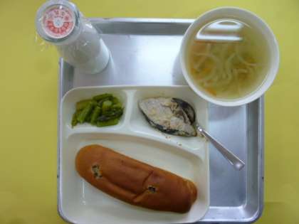 今日の献立は、レーズンパン、かつおのガーリックマヨネーズ焼き、グリーンアスパラガスのソテー、牛乳です。
