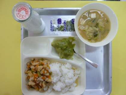 今日の献立は、かやくご飯、味噌汁、抹茶ういろう、牛乳です。