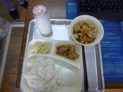 今日の献立は、ご飯、豚肉の生姜醤油かけ、含め煮、あっさりキャベツ、牛乳です。
