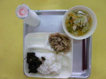 今日の献立は、ご飯、豚肉の胡麻味噌焼き、すまし汁、海苔の佃煮、牛乳です。