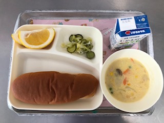 献立は「コーンクリームシチュー・キャベツときゅうりのサラダ・かわちばんかん・黒糖パン・牛乳」です。