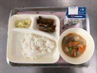 献立は「ちくわのいそべあげ・あつあげとさといものみそ煮・あっさりキャベツ・ごはん・牛乳」です。
