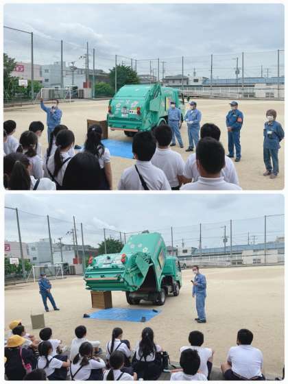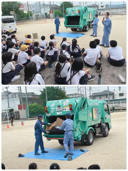 運動場にパッカー車が来て