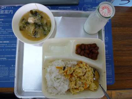 今日の献立は、親子丼、味噌汁、金時豆の煮もの、牛乳でした。