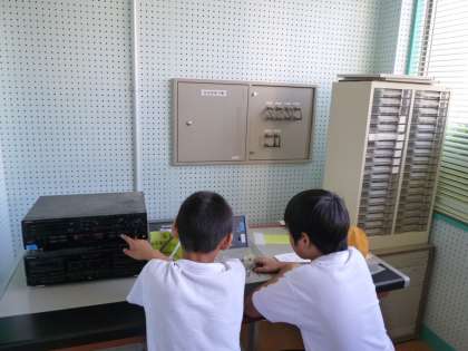 児童朝会の放送、マイクの準備をしたり、音楽をならしたりするのは、放送委員会の仕事です。お昼の放送も、音楽などを流しています。