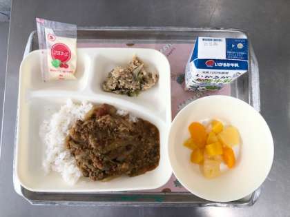 献立は「夏野菜のキーマカレーライス・ゴーヤとツナのマヨネーズ風味・ミックスフルーツ(缶)・牛乳」です。