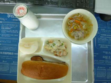 今日の献立は、ごまパン、えびグラタン、キャベツのスープ、なし(豊水)、牛乳でした。