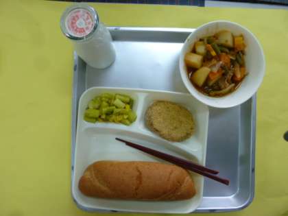 今日の献立は、ライ麦パン、チキンレバーカツ、ケチャップ煮、グリーンアスパラガスのサラダ、牛乳です。